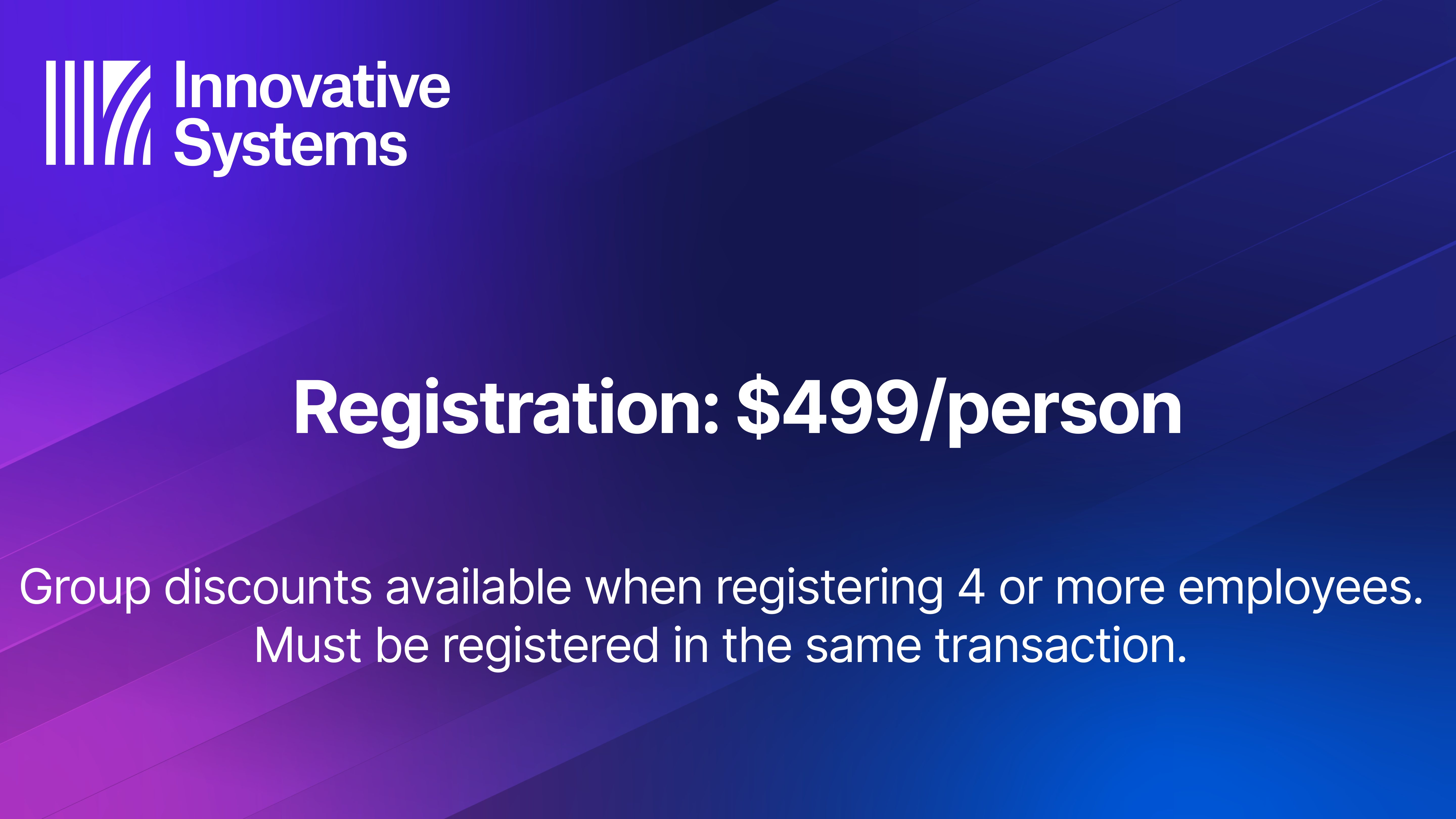 Group discounts available when registering 4 or more employees. Must be registered in the same transaction.